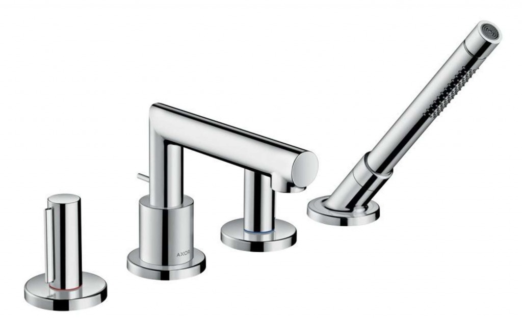 - obsahuje rukojeti, rozety, přepínač, vanový výtok, tyčovou ruční sprchu AXOR Starck se dvěma proudy (# 28532000)