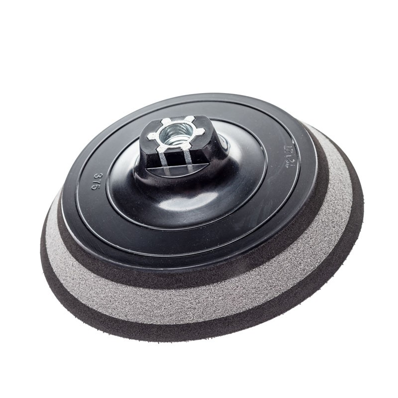 Se suchým zipem, tento upínací talíř výrazně usnadňuje vedení leštičky (lehká šikmá nastavení se vyrovnají a stroj již "netancuje" na povrchu). Díky pevnému provedení (talíř, kaučuk, měkká pěna, kaučuk, suchý zip) je zaručeno pevné spojení mezi kaučukem a plochou suchého zipu.