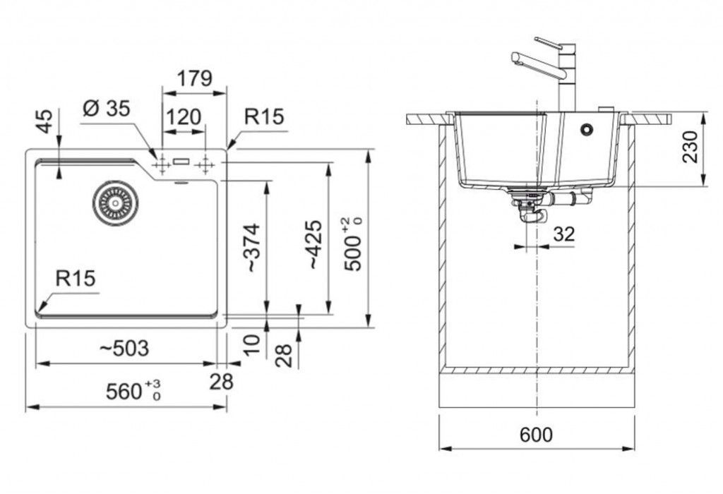 - rozměry dřezu 503 x 425 x 230 mm
