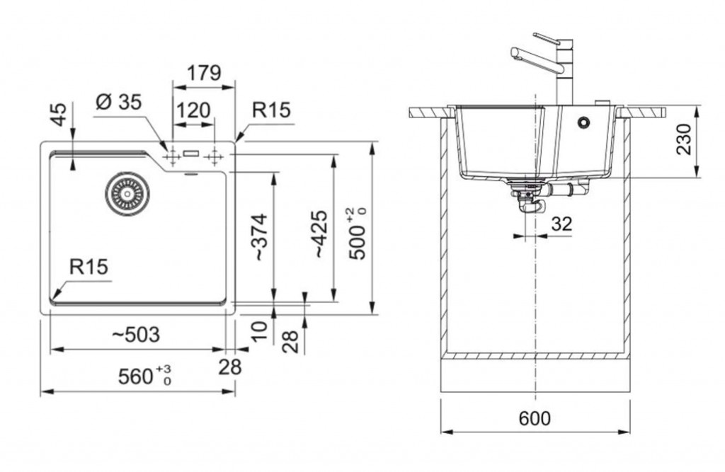 - rozměr výřezu 524 x 464 mm (rádius 15 mm)