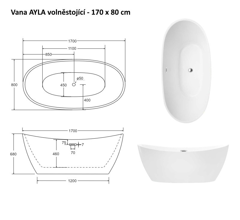 Symetrická volně stojící vana AYLA se vyrábí v rozměru 170 × 80 cm. Krásná masivní vana z prvotřídního sanitárního akrylátu. Konstrukce vany nevyžaduje obklad ani obezdění. Proti mramorovým vanám má nižší hmotnost a snadno se s ní manipuluje. Součástí vany je také odtokový systém click-clack s přepadem.