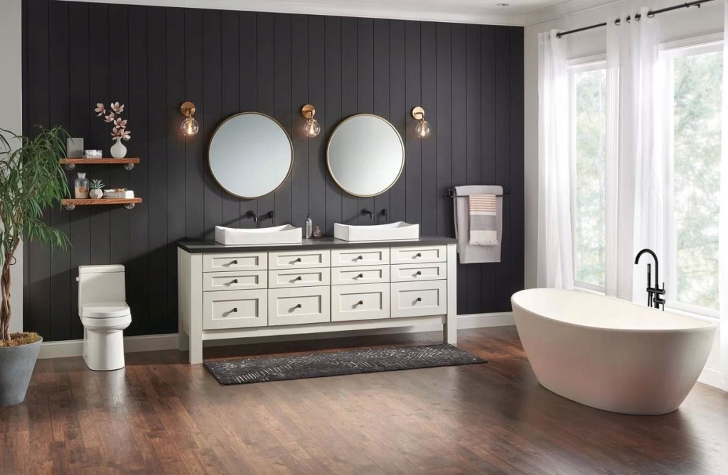 Vanová baterie má na výšku 116,5 cm, kdy kohoutek má vyústění ve 106 cm. Aby se vám baterie pohodlně ovládala, vana by měla mít na výšku okolo 80 cm. Těmto nárokům vyhovuje například volně stojící vana Ferrano, která je vysoká 72 cm, a vanová baterie u ní dokonale vynikne.