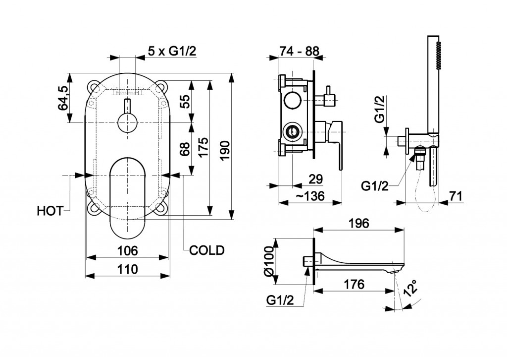 - úhlové připojení na stěnu s držákem na ruční sprchu