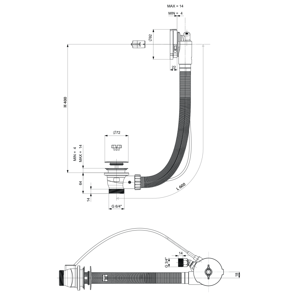 POLYSAN - Vanová souprava s napouštěním, bovden, délka 600, zátka 72, gun metal (71851.60)
