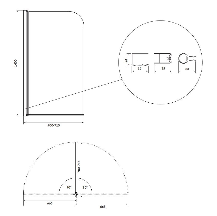 Vanová zástěna EASY NEW je vyrobena z 5 mm silného tvrzeného bezpečnostního skla, které zajišťuje strukturální stabilitu a bezpečné používání. Sklo je opatřeno ochranným hydrofobním povlakem CleanPro, který účinně zabraňuje usazování vodního kamene a nečistot. Nastavitelný nástěnný profil poskytuje větší flexibilitu instalace, protože je vhodný pro použití na nerovných stěnách. Zástěna je vybavena sloupkovým pantem, který umožňuje sklopení zástěny ke zdi na obou stranách, a to v úhlu 180 stupňů. To poskytuje neomezený přístup k vaně a umožňuje perfektní využití prostoru koupelny. Pant má také funkci zvedání křídla, což prodlužuje životnost těsnění. Model se zaobleným horním rohem kromě své praktičnosti slouží také jako dekorativní prvek. Profily jsou černé. Sklo je průhledné. Výška 140 cm, šířka 70 cm. Zástěnu lze instalovat na levou i pravou stranu.