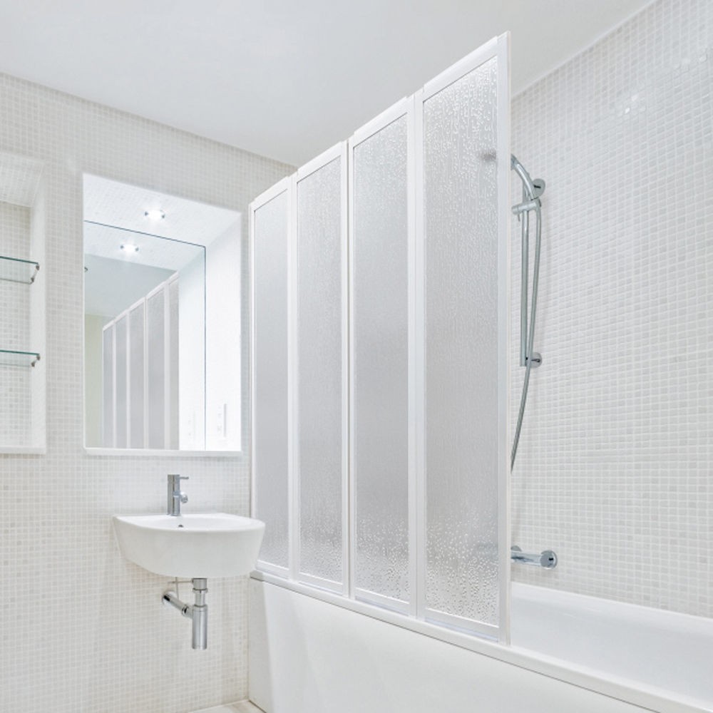 Vanová zástěna čtyřdílná 114x140cm bílý rám výplň plexisklo/ neprůhledné sklo
