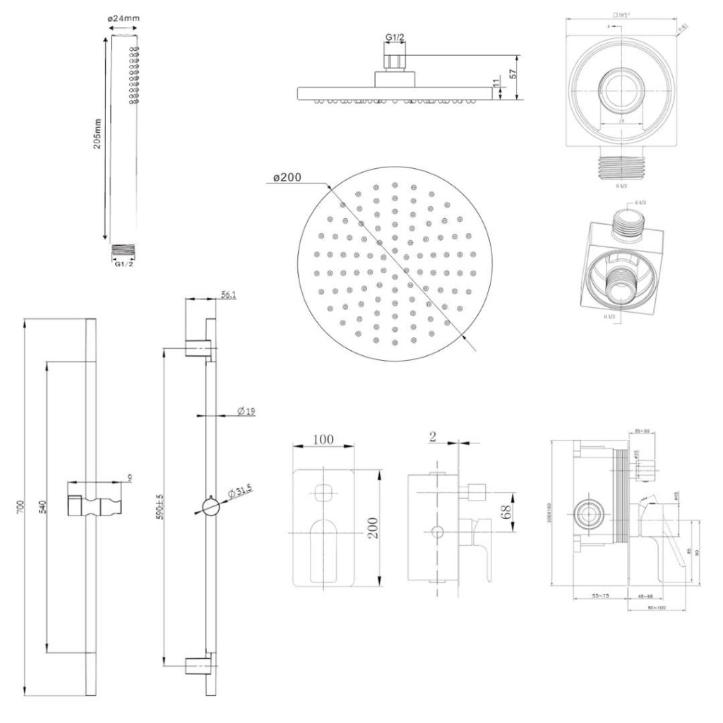 horní sprchu 200 mm se sprchovým ramenem 350 mm