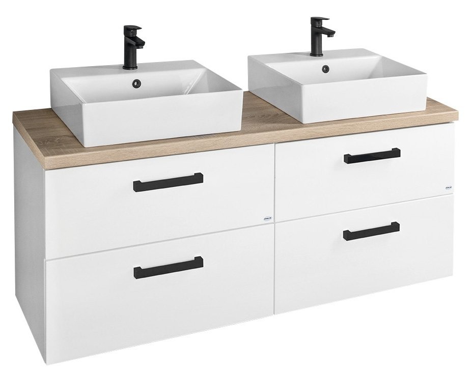 Koupelnový nábytek VEGA s deskou VEGA (HPL) v dekoru dub platin lze kombinovat s umyvadly na postavení.