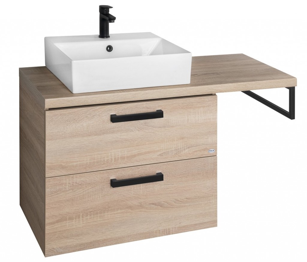 Koupelnový nábytek VEGA s deskou VEGA (HPL) v dekoru dub platin lze kombinovat s umyvadly na postavení.
