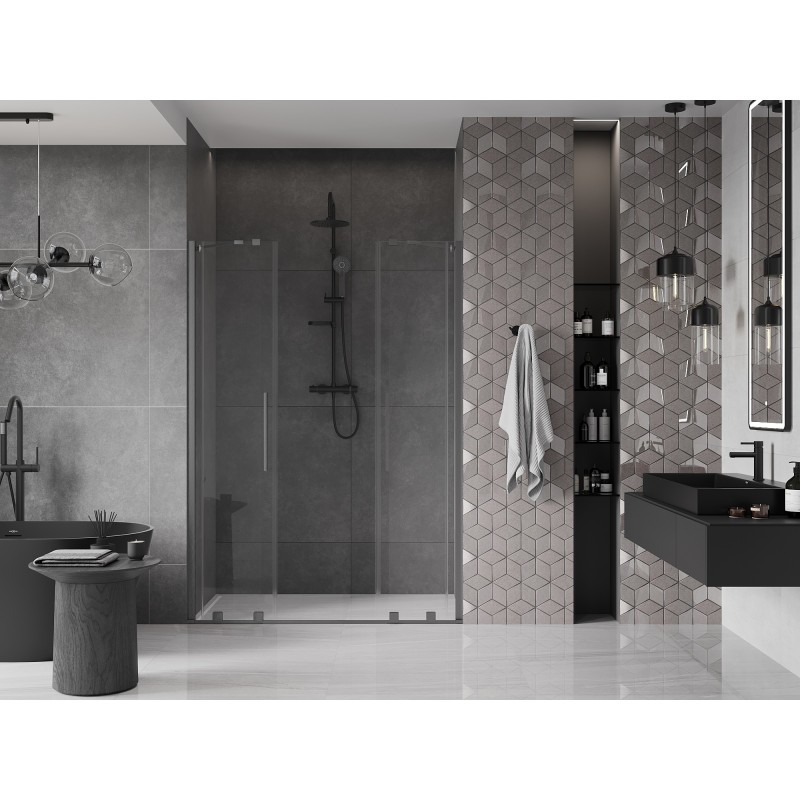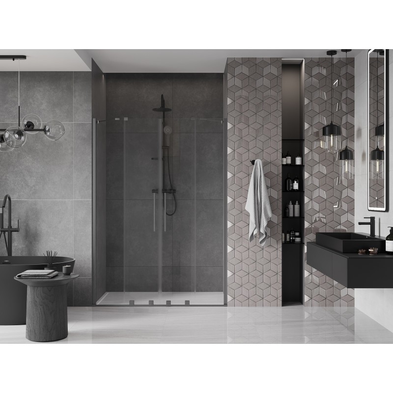 V nabídce jsou sprchové zástěny VELAR DUO od šířky 140 až do 200 cm a v různých barevných variantách skla jako je klasické čiré, dekorované nebo grafit.
