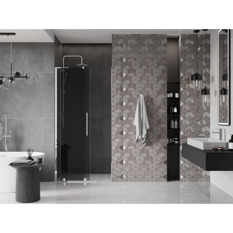 Sprchové dveře WALK-IN s nerezovým ocelovým madlem výšky 200 cm s univerzální montáží (pravá/ levá) z kolekce Mexen VELAR L. Funkční posuvné dveře se spolehlivými válečky, které zaručují plynulé a tiché posouvání. Ochranná nano technologie Easy Clean na tvrzeném skle o síle 8 mm usnadňuje jejich čištění, takže si můžete déle užívat dokonale průhledné a lesklé sklo. I přesto doporučujeme používat stěrku, která zamezí usychání kapiček na skle a vzniku nevzhledného matného povrchu.