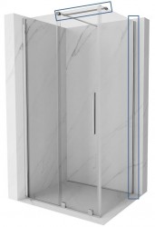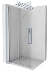 Sprchový kout VELAR L s posuvnými dveřmi a boční stěnou je vysoký 200 cm. Funkční posuvné dveře mají nerezové madlo a posouvají se spolehlivými válečky, které zaručují plynulý a tichý chod. Ochranná nano technologie Easy Clean na tvrzeném skle o síle 8 mm usnadňuje jejich čištění, takže si můžete déle užívat dokonale průhledné a lesklé sklo. I přesto doporučujeme používat stěrku, která zamezí usychání kapiček na skle a vzniku nevzhledného matného povrchu. Instaluje se pomocí hliníkových, nástěnných profilů s možností vyrovnání nerovností stěn, spodní hliníkové lišty a kout je ještě ukotven rohovou stabilizační vzpěrou tvaru L z nerezové oceli.