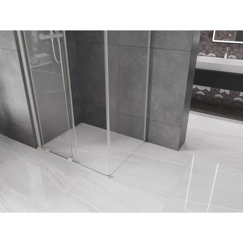 Sprchový kout VELAR s posuvnými dveřmi a boční stěnou je vysoký 200 cm. Funkční posuvné dveře mají nerezové madlo a posouvají se spolehlivými válečky, které zaručují plynulý a tichý chod. Ochranná nano technologie Easy Clean na tvrzeném skle o síle 8 mm usnadňuje jejich čištění, takže si můžete déle užívat dokonale průhledné a lesklé sklo. I přesto doporučujeme používat stěrku, která zamezí usychání kapiček na skle a vzniku nevzhledného matného povrchu. Instaluje se pomocí hliníkových, nástěnných profilů s možností vyrovnání nerovností stěn, spodní hliníkové lišty a kout je ještě ukotven stabilizačními vzpěrami z nerezové oceli.