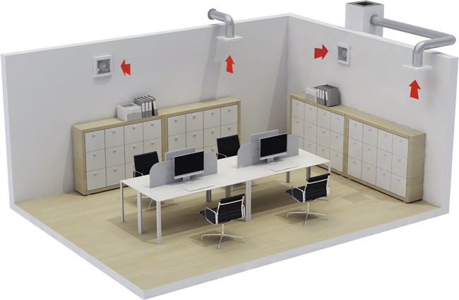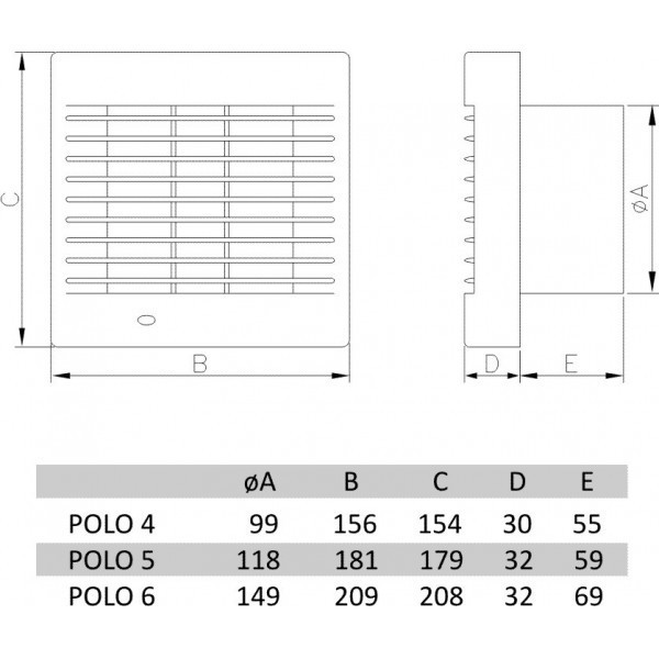 Domovní nástěnný axiální ventilátor kompaktních rozměrů, vyrobený z bílé hmoty ABS, která je antistatická a lehce čistitelná.