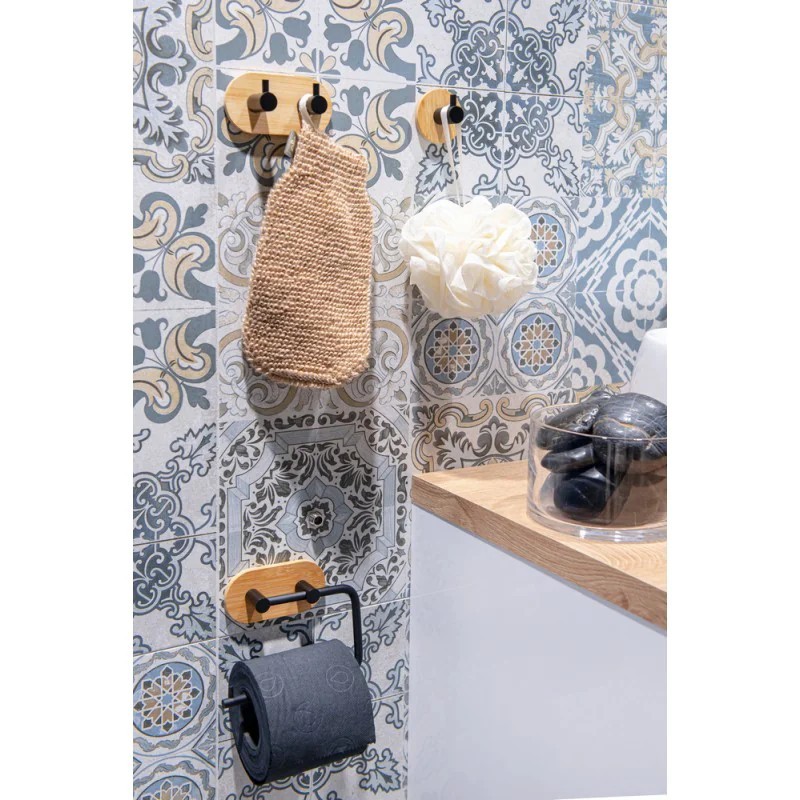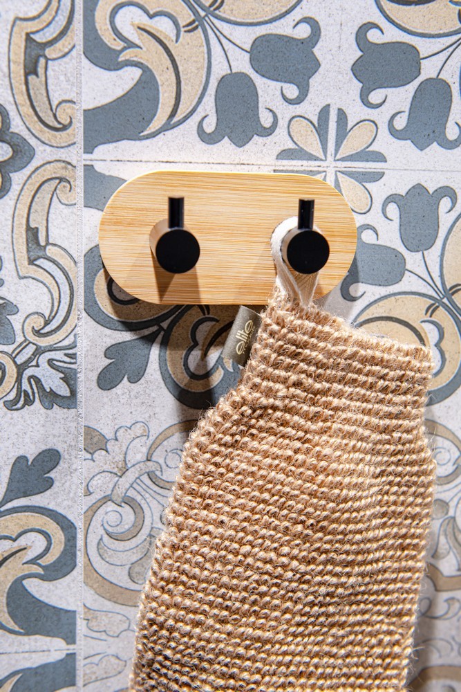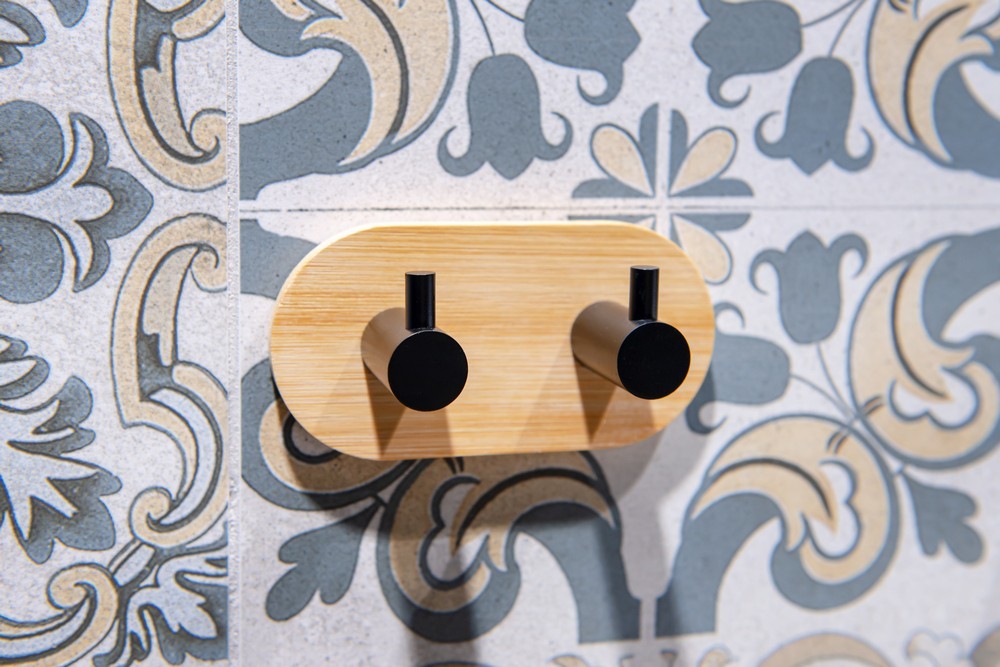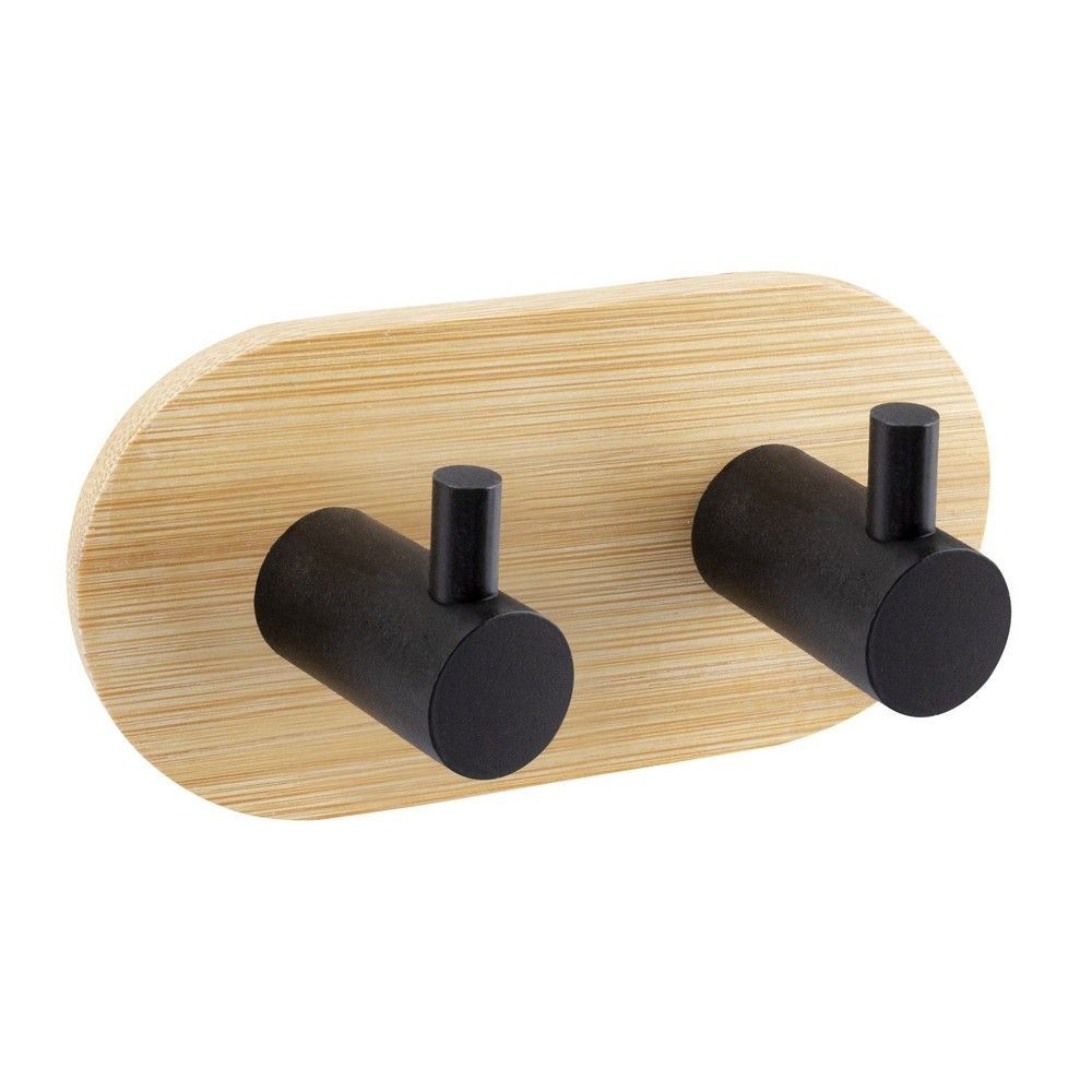 Kulatý věšák - 2-háček z kvalitní, černě lakované, oceli v kombinaci s populárním bambusem. Největší výhodou tohoto věšáku je jednoduché lepení na obklady pomocí velice silné 3M pásky. Samolepící koupelnové doplňky jsou ideálním řešením, pokud nechcete vrtat do obkladů. Velmi kvalitní lepící páska 3M přilne k různým povrchům a umožňuje snadné odstranění doplňků bez zanechání stop či poškození. Jeho maximální nosnost je 1 kg.