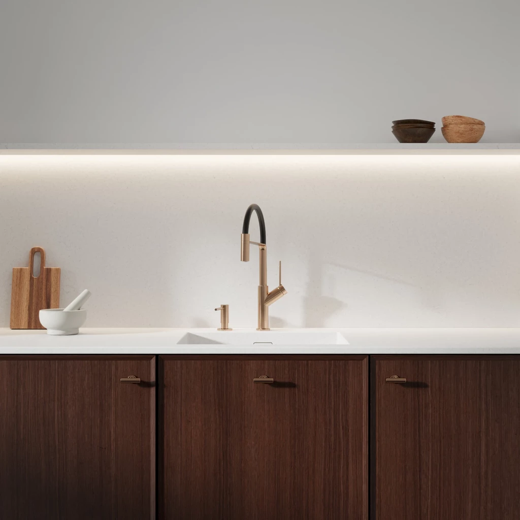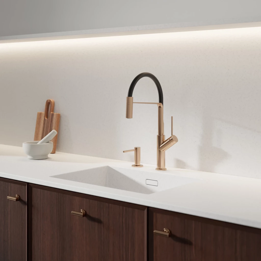 Kuchyňská baterie OMNIRES VITA kombinuje vytříbený tvar s vynikající funkčností. Její moderní, minimalistický design je založen na geometrických tvarech oblouku a vytváří lehkou a vizuálně ucelenou siluetu. Otočný výtok s funkcí sprchy lze oddělit, což umožňuje přesný průtok vody, kamkoli je to potřeba. Flexibilní černá gumová část a optimální výška baterie usnadňuje každodenní používání. Tento model je vybaven vysoce kvalitní keramickou kartuší a inovativními technologickými řešeními, která snižují spotřebu vody na polovinu a zároveň zajišťují pohodlí a snadné používání.