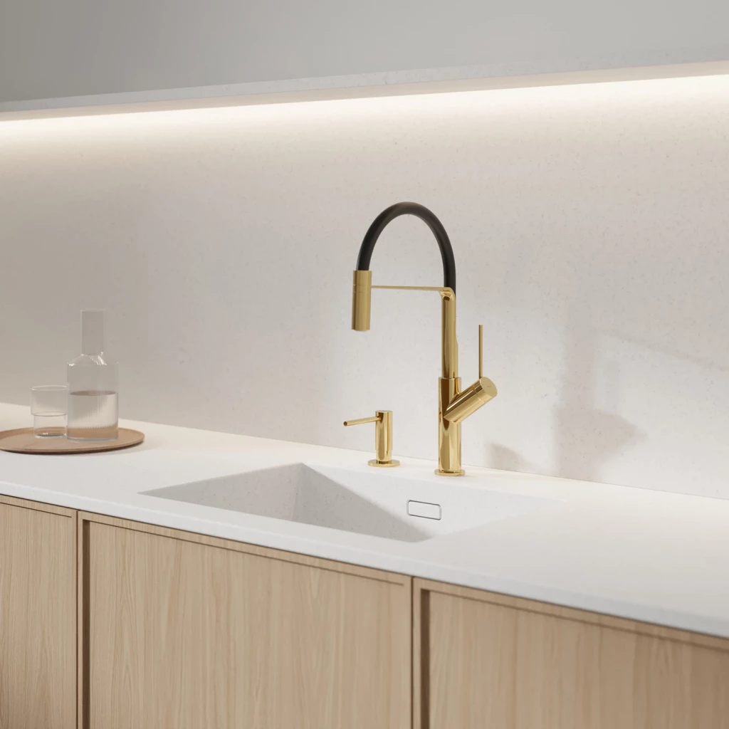 Kuchyňská baterie OMNIRES VITA kombinuje vytříbený tvar s vynikající funkčností. Její moderní, minimalistický design je založen na geometrických tvarech oblouku a vytváří lehkou a vizuálně ucelenou siluetu. Otočný výtok s funkcí sprchy lze oddělit, což umožňuje přesný průtok vody, kamkoli je to potřeba. Flexibilní černá gumová část a optimální výška baterie usnadňuje každodenní používání. Tento model je vybaven vysoce kvalitní keramickou kartuší a inovativními technologickými řešeními, která snižují spotřebu vody na polovinu a zároveň zajišťují pohodlí a snadné používání.