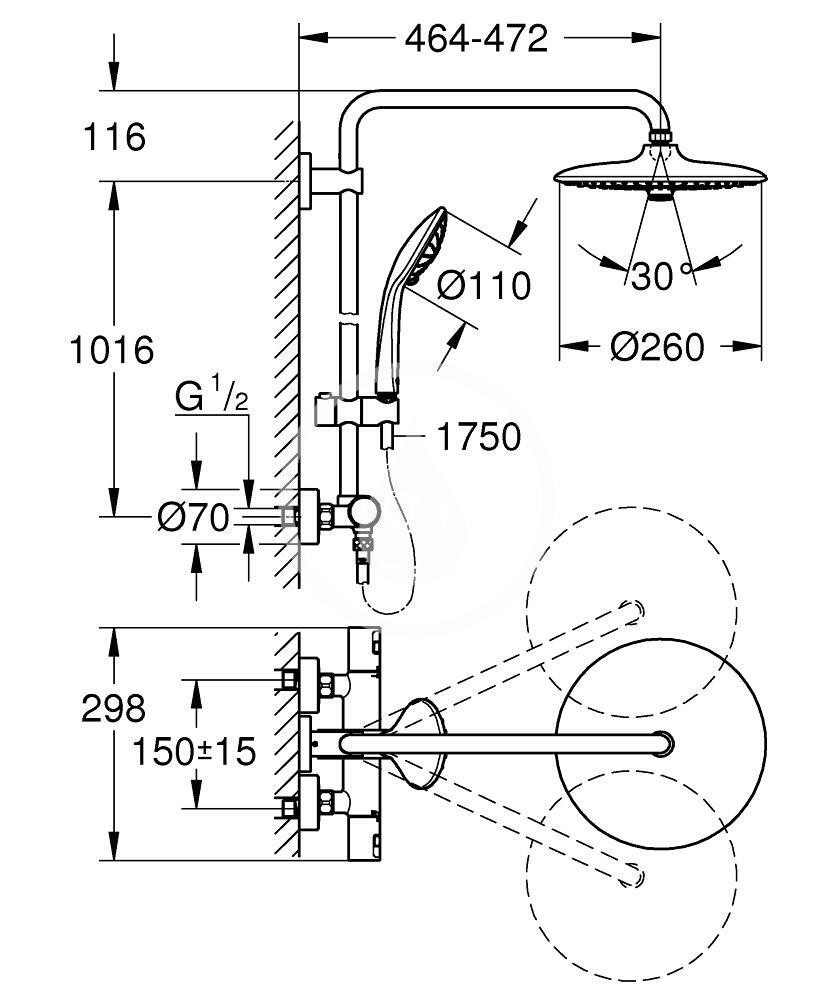 horizontální otočné sprchové rameno 450 mm a poličku Easyreach