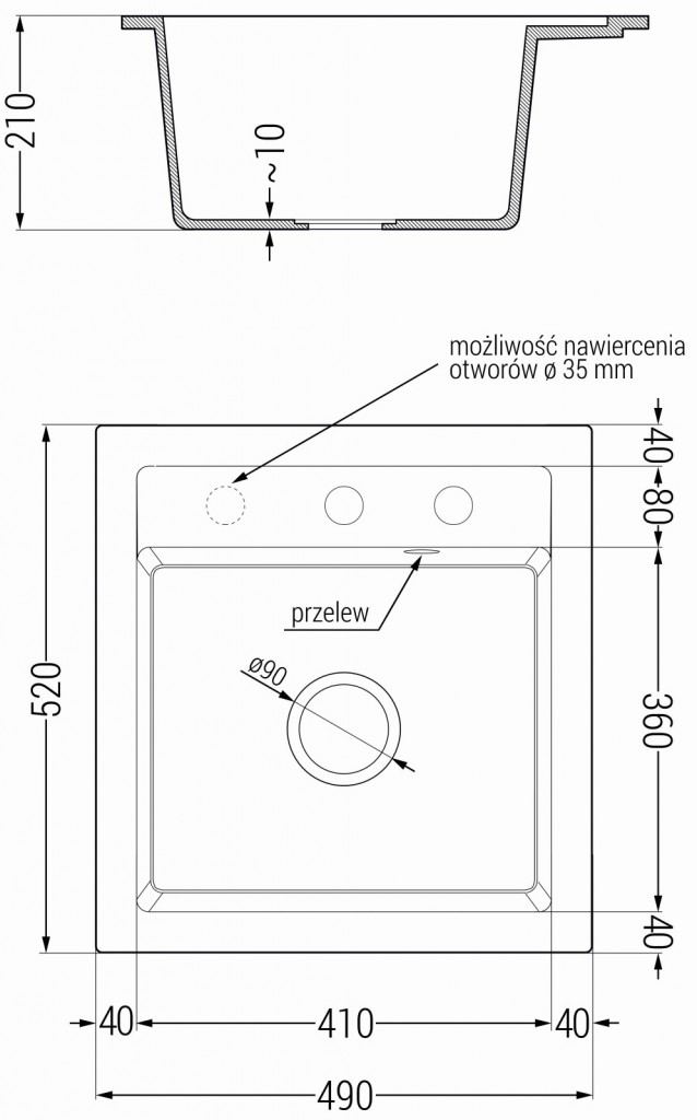 - odtokový otvor: 3,5 ”; fi = 90 mm
