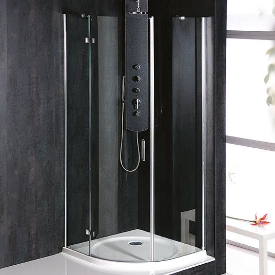 Čtvrtkruhová zástěna 80x80 je tvořena třemi odlišnými díly skel, přičemž samotné dveře jsou navrženy na optimální šířku 55 cm. To zajišťuje ideální vstup a pohodlné otevírání, které nevyžaduje velký prostor před sprchovým koutem. Běžné, levnější řešení tohoto typu zástěny má dvě úzká rovná boční skla a příliš veliké a těžké dveře.