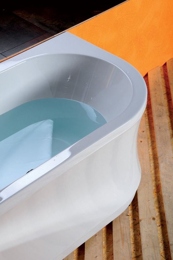 Vana s pohodlně tvarovanými stěnami pro opření zad na obou stranách a odtokem umístěným uprostřed.