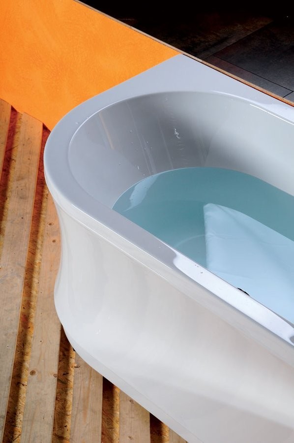 Vana s pohodlně tvarovanými stěnami pro opření zad na obou stranách a odtokem umístěným uprostřed.