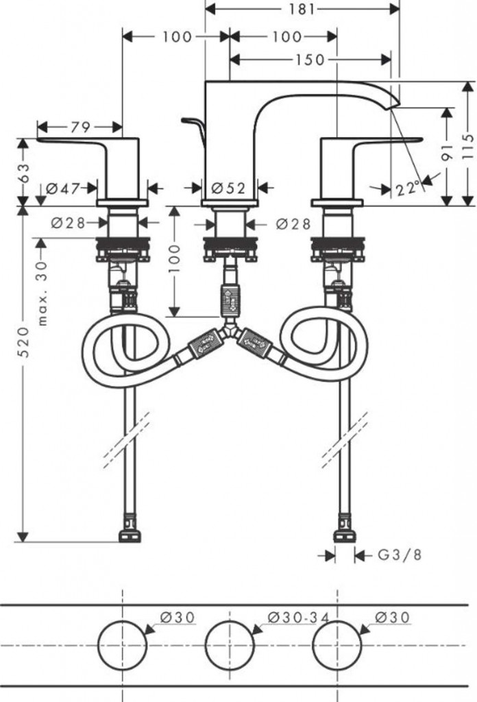 Vivenis 3otvorová umyvadlová baterie 90 s odtokovou soupravou a táhlem