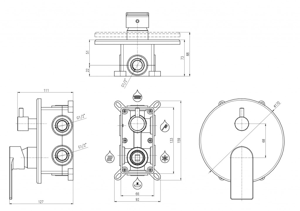 Tuto baterii můžete použít buď do sprchového koutu jako kombinaci tří prvků a nebo k vaně jako kombinaci např. napouštění přepadem, ruční sprcha a hlavová sprcha nebo výtokové ramínko, ruční sprcha a hlavová sprcha.