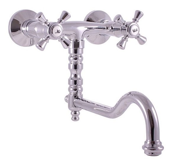 Vodovodní baterie dřezová nástěnná s kulatým otočným ramínkem.