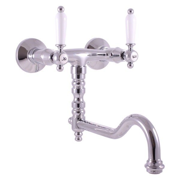 Vodovodní baterie dřezová nástěnná s kulatým otočným ramínkem.