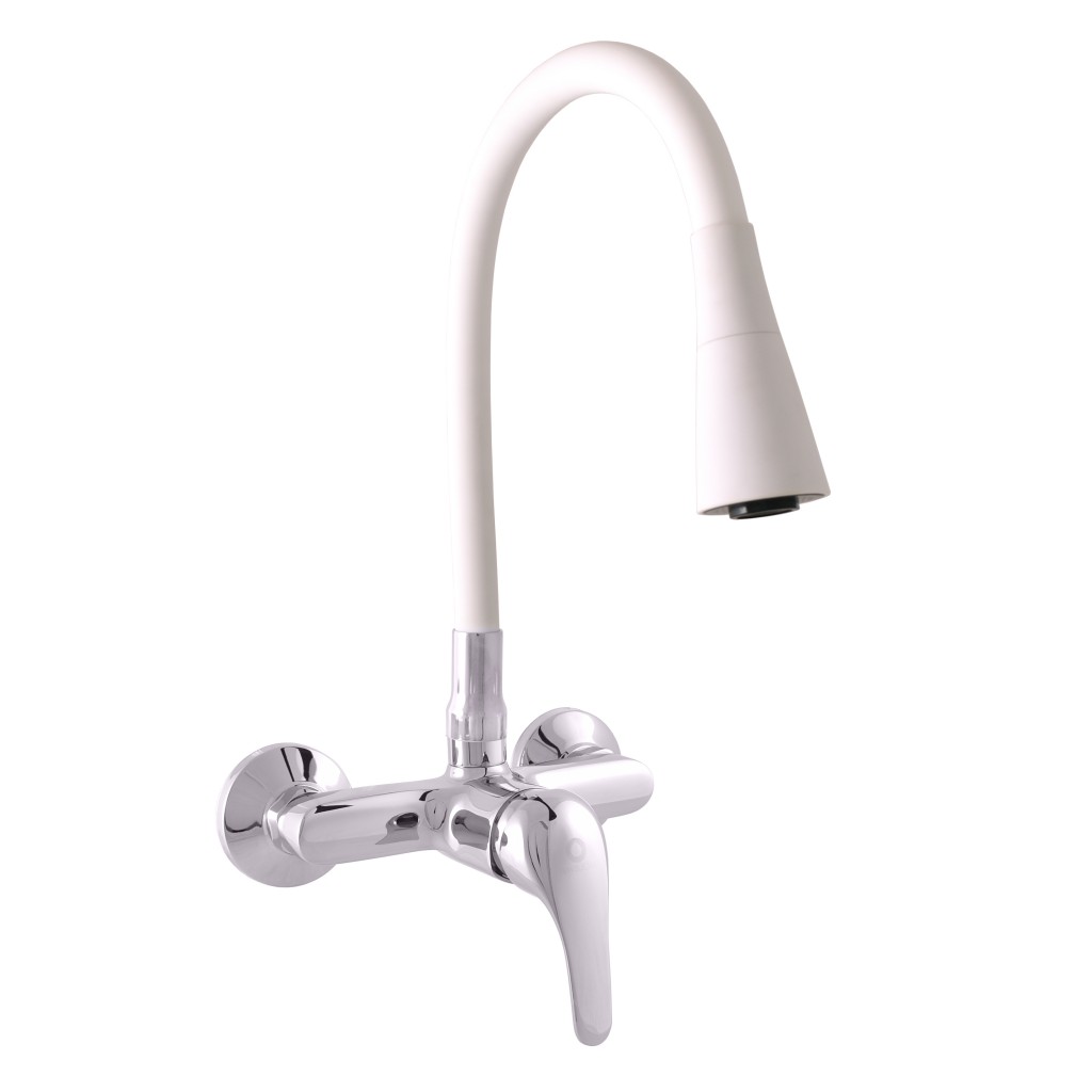 Vodovodní baterie dřezová nástěnná s flexibilním otočným ramínkem se sprchou.