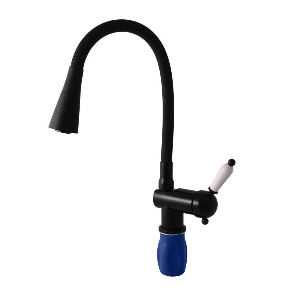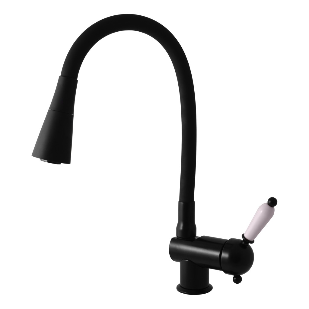 Vodovodní baterie dřezová stojánková s flexibilním ramínkem se sprchou - černá matná.