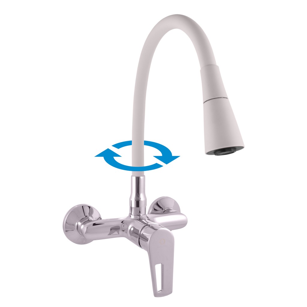 Vodovodní baterie dřezová nástěnná s flexibilním otočným ramínkem se sprchou.