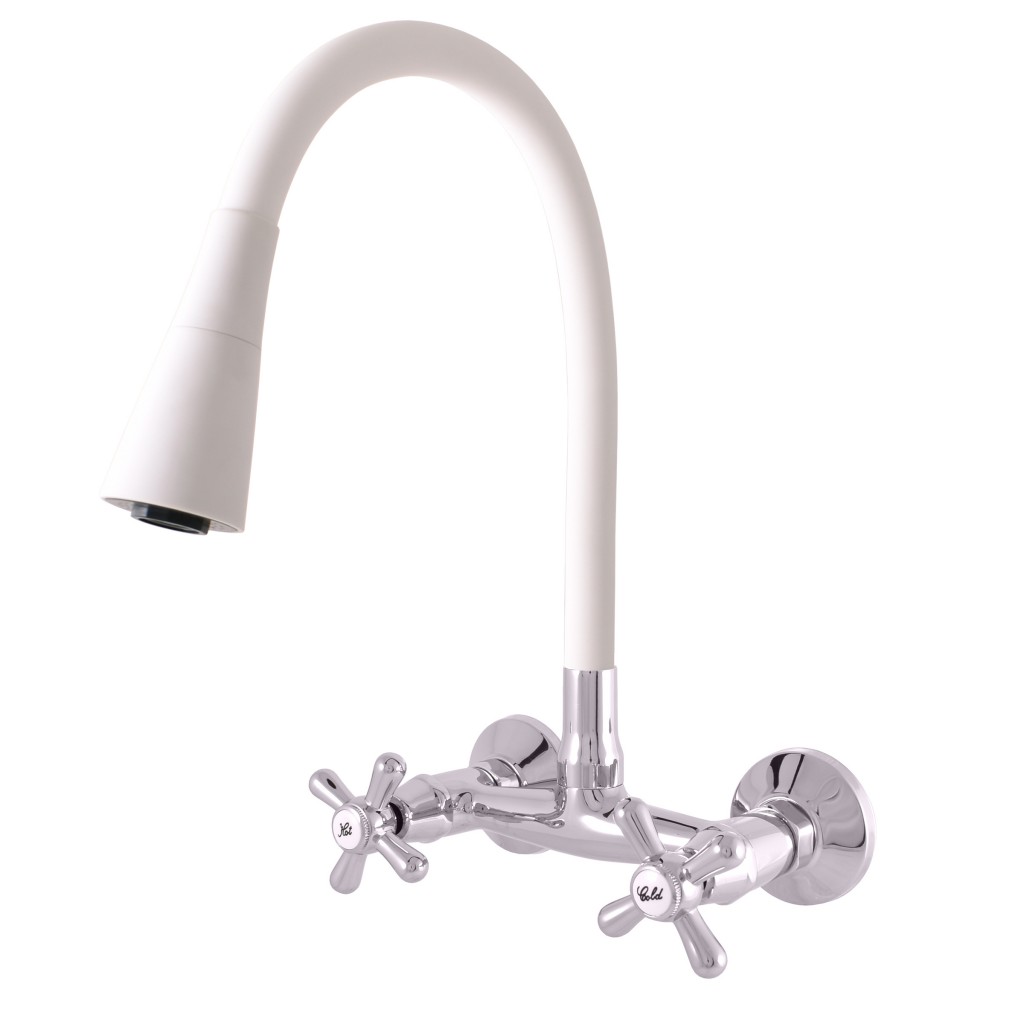 Vodovodní baterie dřezová nástěnná s flexibilním otočným ramínkem se sprchou.