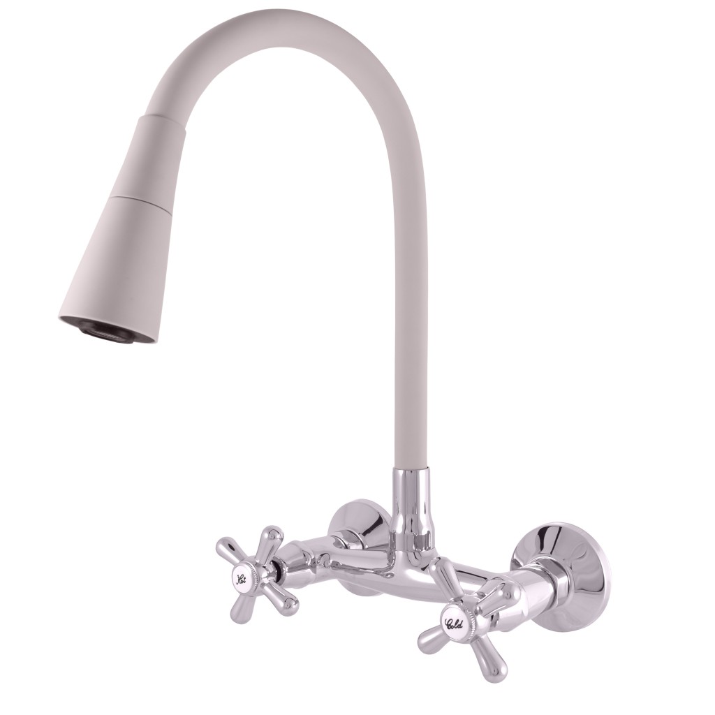 Vodovodní baterie dřezová nástěnná s flexibilním otočným ramínkem se sprchou.