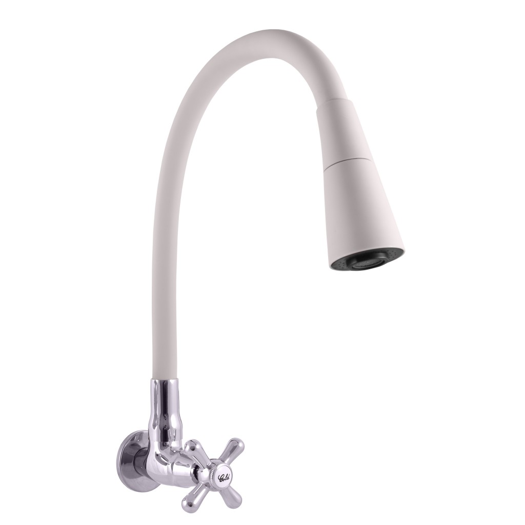 Vodovodní baterie nástěnná na jednu vodu s flexibilním otočným ramínkem se sprchou.