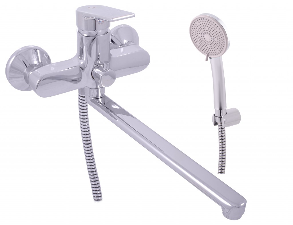 Vodovodní baterie pro vanu a umyvadlo nástěnná s plochým, otočným ramínkem, sprchou a pevným držákem.