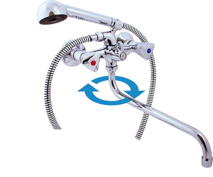 Vodovodní baterie pro vanu a umyvadlo nástěnná s keramickým přepínačem, kulatým ramínkem, sprchou a vidlicí na odkládání sprchy.
