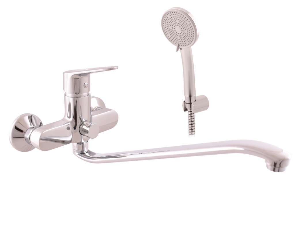 Vodovodní baterie pro vanu a umyvadlo nástěnná s plochým, otočným "S" ramínkem, sprchou a pevným držákem.