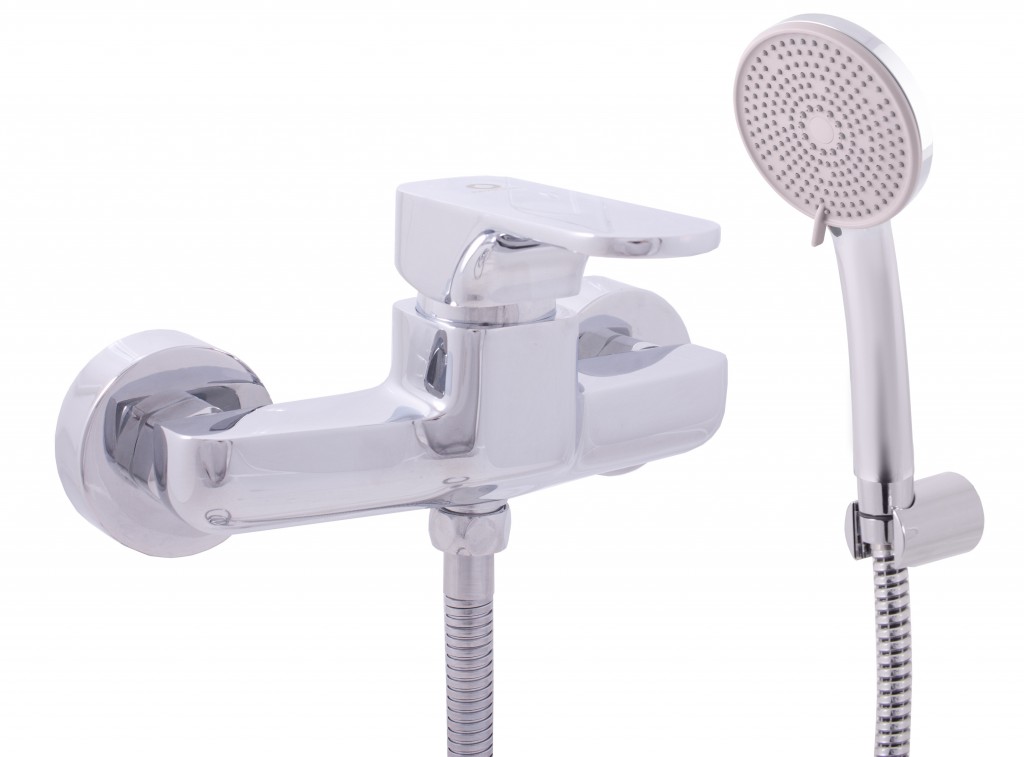 Vodovodní baterie sprchová nástěnná se sprchou a pevným držákem.