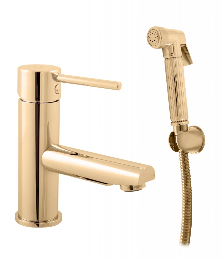 Vodovodní baterie umyvadlová/bidetová stojánková se sprškou bez otvírání odpadu. tato baterie je vybavena keramickou kartuší o průměru 35 mm KA3501 perlátor je antivápenný MA0010Z provedení zlato součástí balení této baterie je: kovová sprcha s tlač… (celý popis)