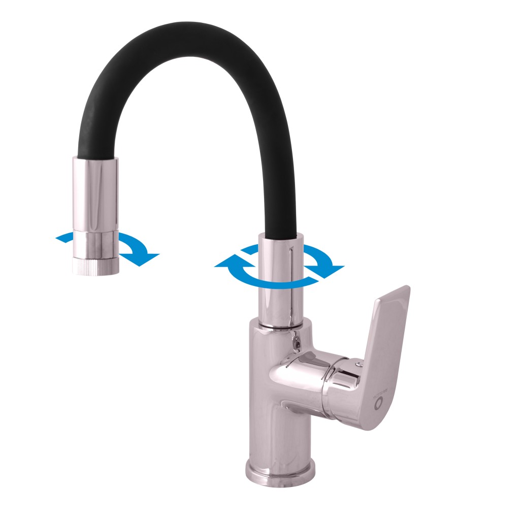 Vodovodní baterie umyvadlová stojánková s flexibilním otočným ramínkem s dvoupolohovým perlátorem.