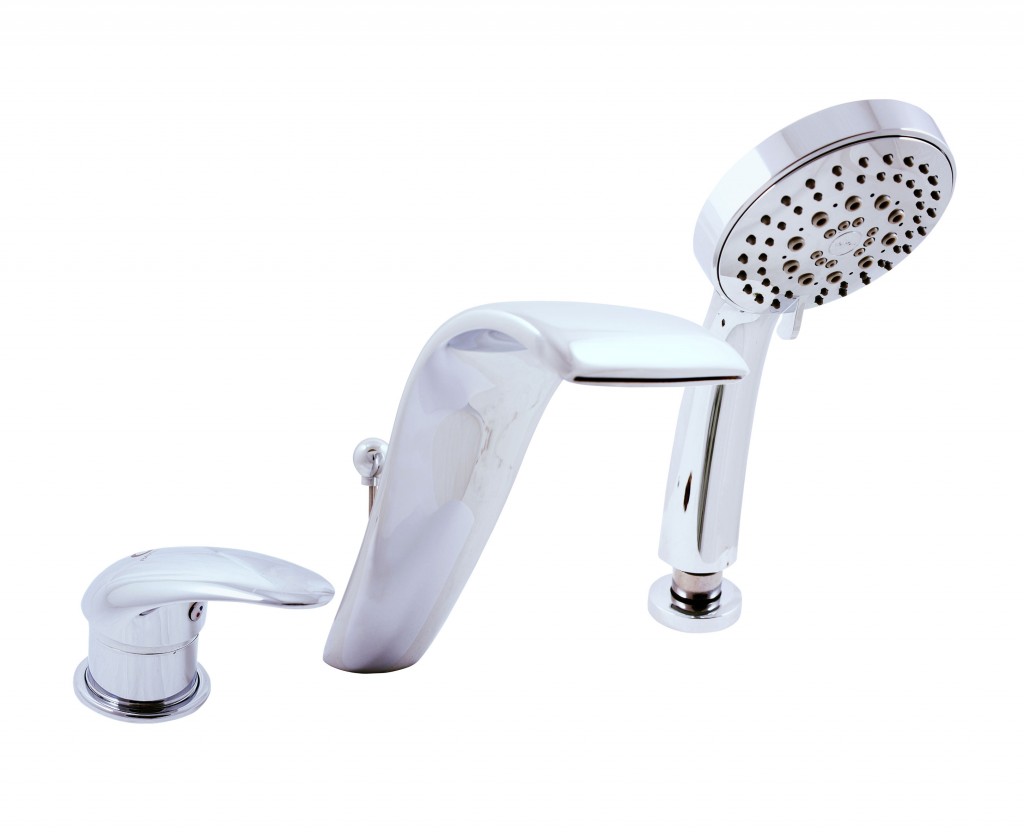 Vodovodní baterie vanová stojánková tříotvorová s přepínačem ve výtoku, samonavíjecí sprchou a 2m hadicí.