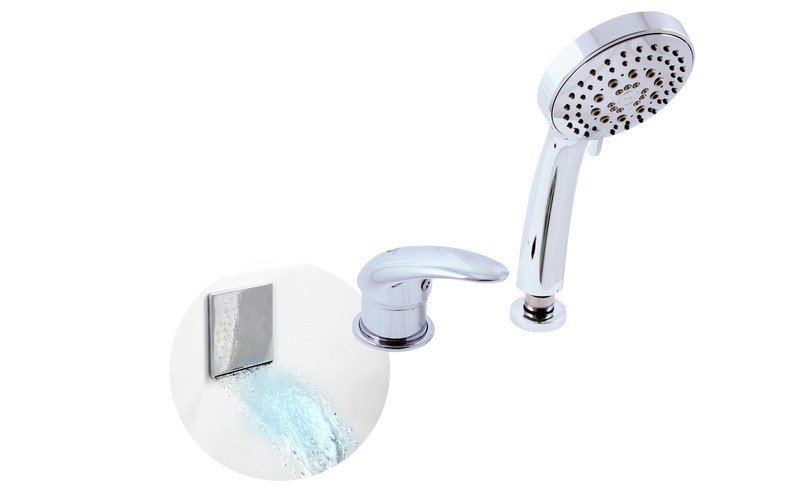 Vodovodní baterie vanová stojánková tříotvorová s přepínačem v mixu, vodopádovým výtokem VOD6301, samonavíjecí sprchou a 2m hadicí.