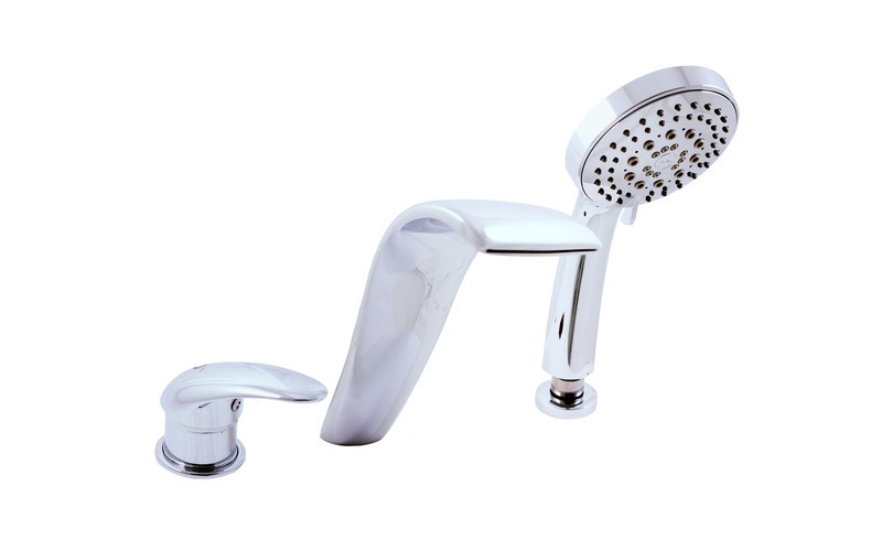Vodovodní baterie vanová stojánková tříotvorová s přepínačem v mixu, samonavíjecí sprchou a 2m hadicí.