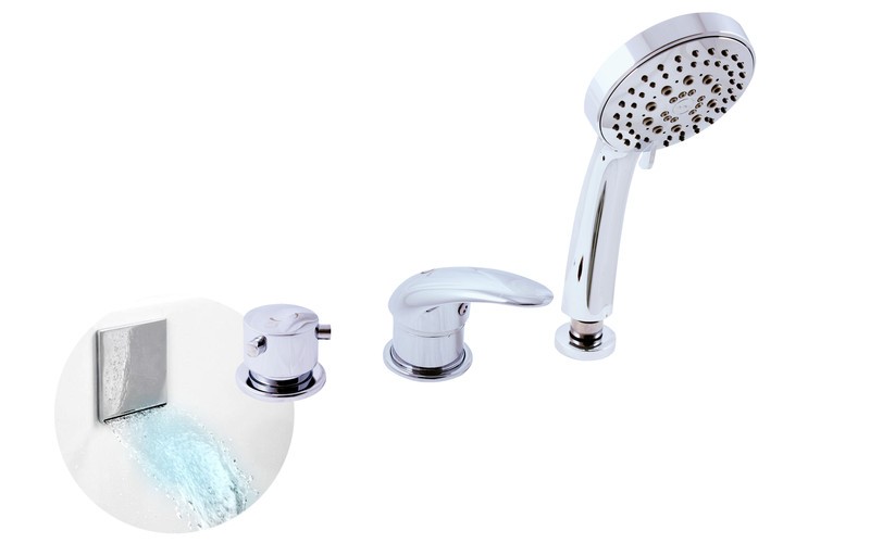 Vodovodní baterie vanová stojánková čtyřotvorová s keramickým přepínačem MD0448, vodopádovým výtokem VOD6301, samonavíjecí sprchou a 2m hadicí.