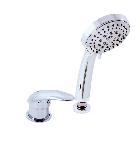 Vodovodní baterie vanová stojánková dvouotvorová s přepínačem v mixu, samonavíjecí sprchou a 2m hadicí, pro napouštění přes přepad sifonu.