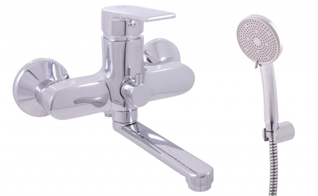 Vodovodní baterie vanová nástěnná s plochým otočným ramínkem, sprchou a pevným držákem.