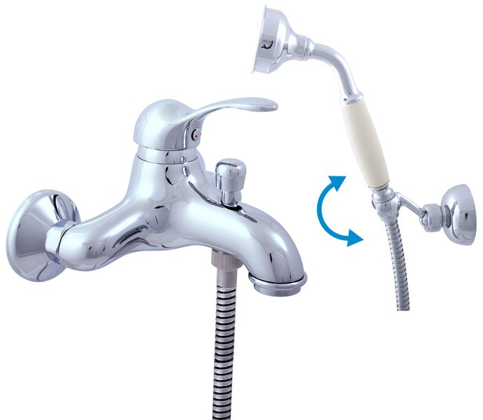 Vodovodní baterie vanová nástěnná se sprchou a otočným držákem.