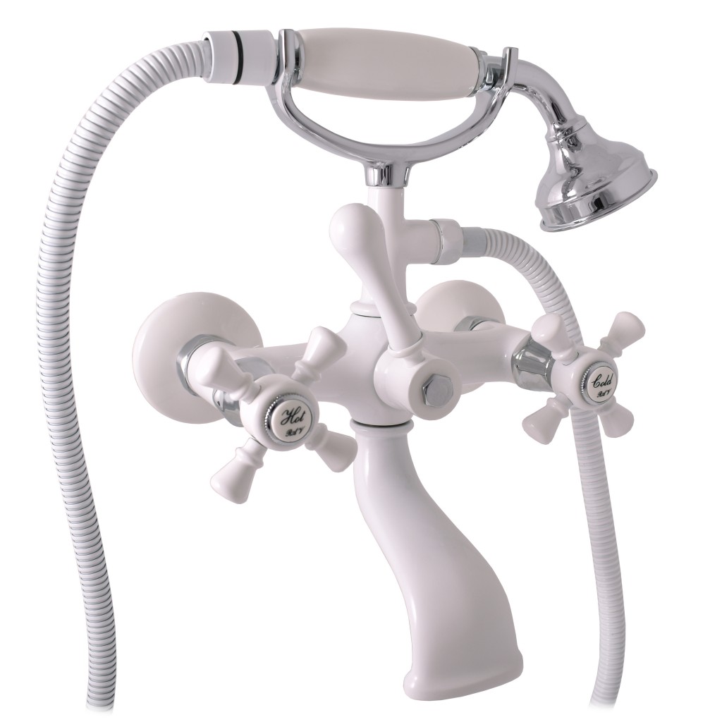 Vodovodní baterie vanová nástěnná s vidlicí na odkládání sprchy a se sprchou.